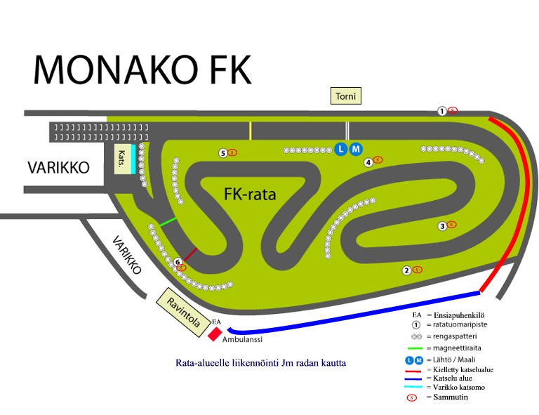 Mullilahden MonakoRadalla puomi, Jos kiinni soita 0500333107Muistathan sulkea jos lähdet viimeisenä .Mullilahden Monako sijaitsee Sastamalassa Puhkalaitumentie 746. Saavuttaessa kaupungin suunnasta maamerkkinä olkoon Nesteen huoltoasema valtatie 12 varrella kantatien 252 risteyksessä. Tästä ajetaan n. 7 km etelään Punkalaitumelle päin. Radan merkkinä on tolpan päähän hitsattu mikroauto kaupungin suunnasta saavuttaessa tien vasemmalla puolella. FK-rata on auki etusivun mukaisesti. Ratamaksut 20,00 eur päivältä. Seuran jäsenilta Sopimuksen mukaan. Muistathjan osallistua talkoisiin Sopimuksen mukaan. Kausikortti maksaa 100,00 euroa sisarkortti 70,00 euroa. Maksun voi suorittaa paikan päällä, mikäli seuran väkeä on paikalla. Muussa tapauksessa voitte ottaa yhteyttä Matti Puhakkaan ja sopia muusta järjestelystä (matti(at)monako.fi). Radalla on huoltorakennus, jossa on kilpailujen yhteydessä käytössä WC, suihku, saunat,vesi, kahvio sekä paineilmaa kuten myös hitsausmahdollisus. Osallistuville autokunnille on tarjolla korvausta vastaan 220V käyttösähkö majoitusalueelle. Kilpailujen yhteydessä perittävä majoittumismaksu sisältäen käyttösähkön (ei lämmitykseen käytettävä) 10,00 euroa päivältä. Radalla on yksi alfano-nauha. Ajanottojärjestelmää on kehitetty huomattavasti, ja kilpailut on realiaikaisesti siirrettävissä nettiin. Kierrosaikoja pystyy seuraamaan kilpailujen aikana katsastuskopin ikkunasta reaaliaikaisesti. Rakenteellisia parnnuksia on myös tehty; kanttikivet on uusittu ja maalattu syksyllä samalla kun asfaltti laskettiin. Rata-alueelle on rakennettu kesä 2006 aikana pienimuotoinen katsomo katsastuskopin katolle sekä katsomo pääradan viereen syksyllä 2008. Kilpailujen aikana katseleminen on suositeltavinta joko katsomoista tai kahviontakaisella penkereellä. Radalle laitettiin uusi pinnoite 6.8.2010 |